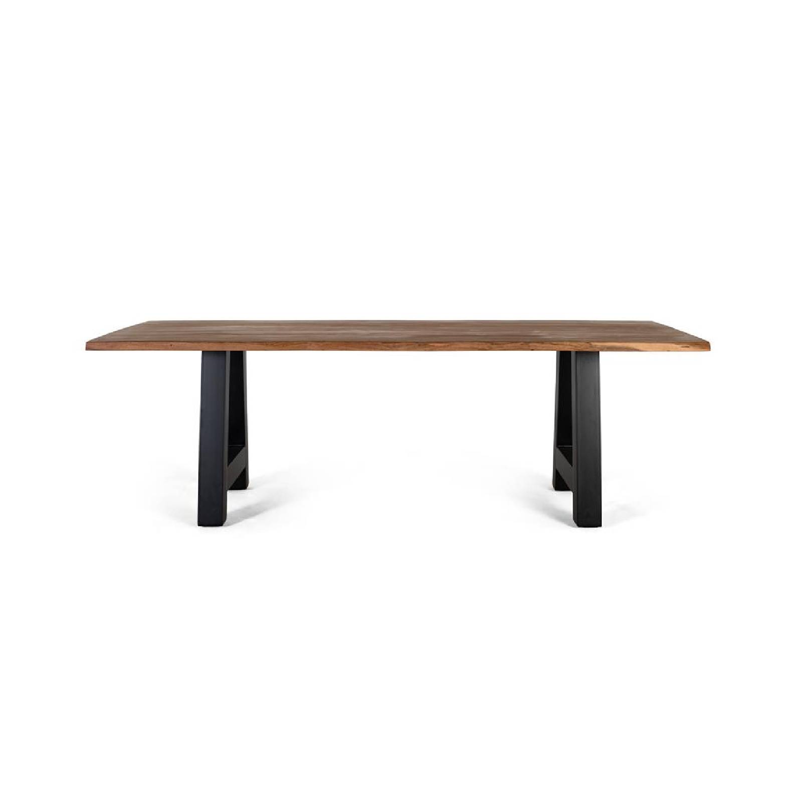 Table à manger en bois d'acacia et métal, le plateau est exposé à des variations de design dues au naturel du bois. Comme il s’agit de bois naturel, il peut être livré avec ses nœuds et veines d’origine. Il comprend des goujons réglables qui empêchent le mouvement et protègent le sol des rayures.
