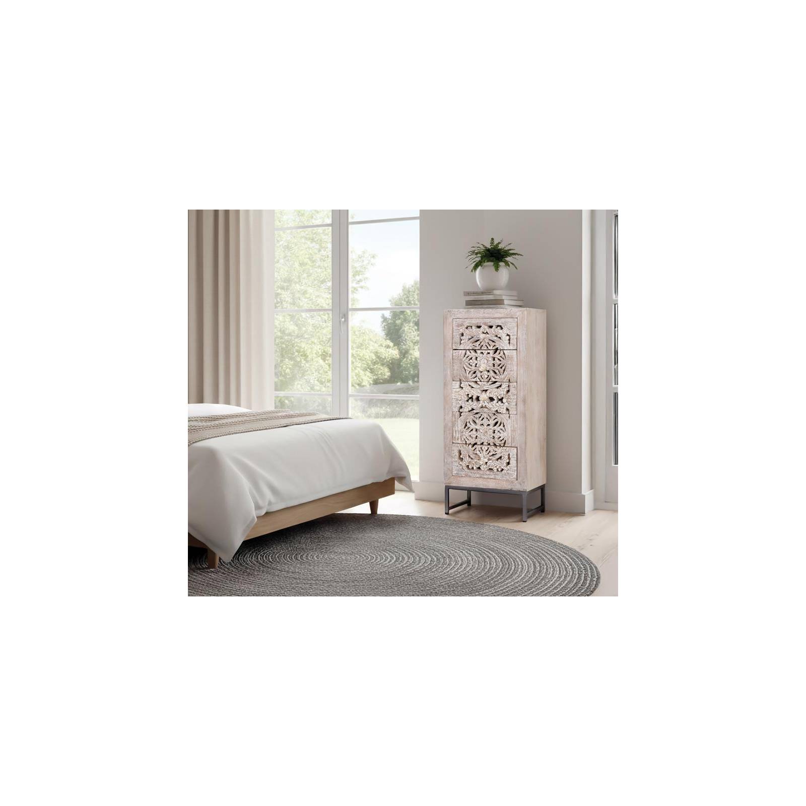 COMMODE À 5 TIROIRS EN BOIS DE MANGUIER SCULPTÉE À LA MAIN E PIEDS EN METAL