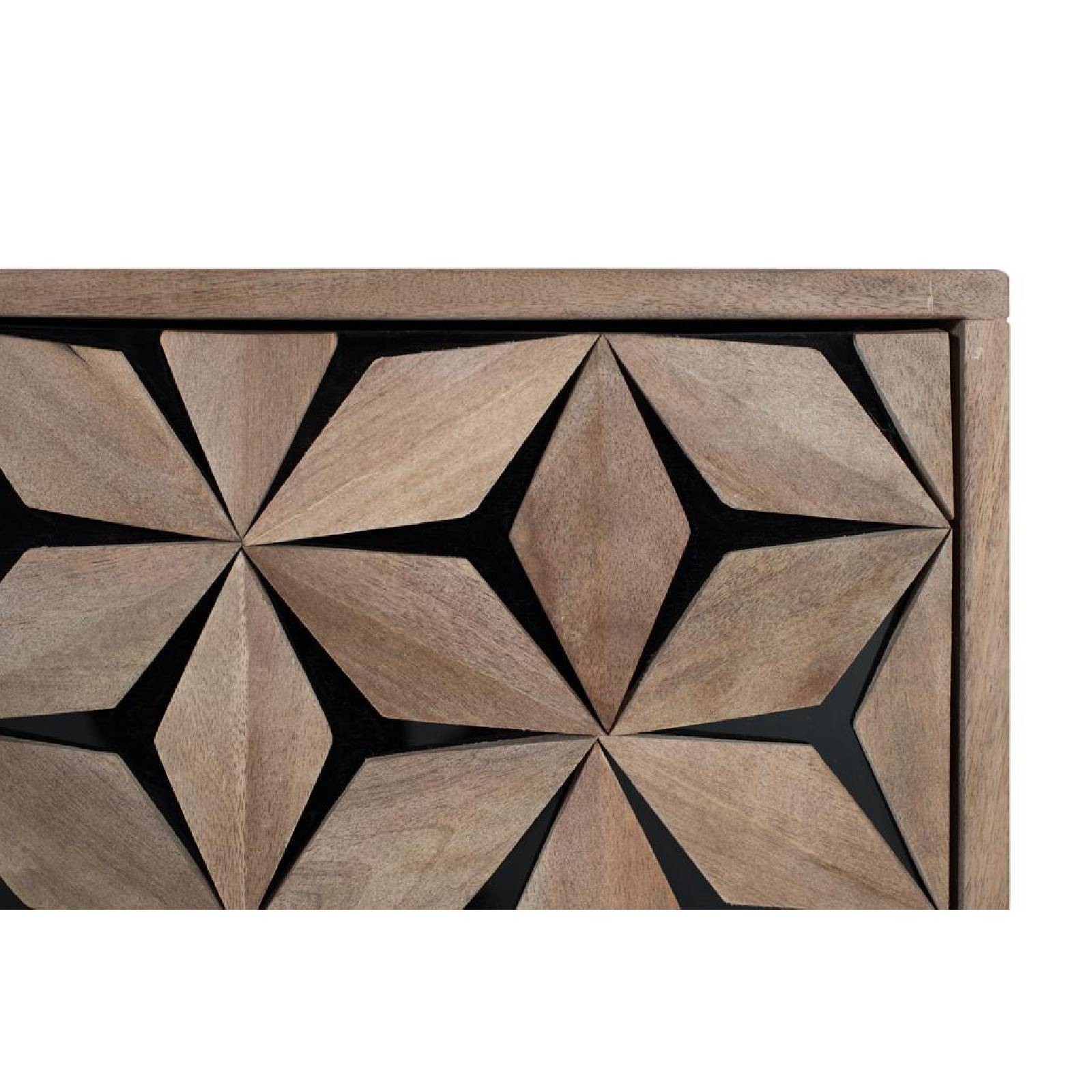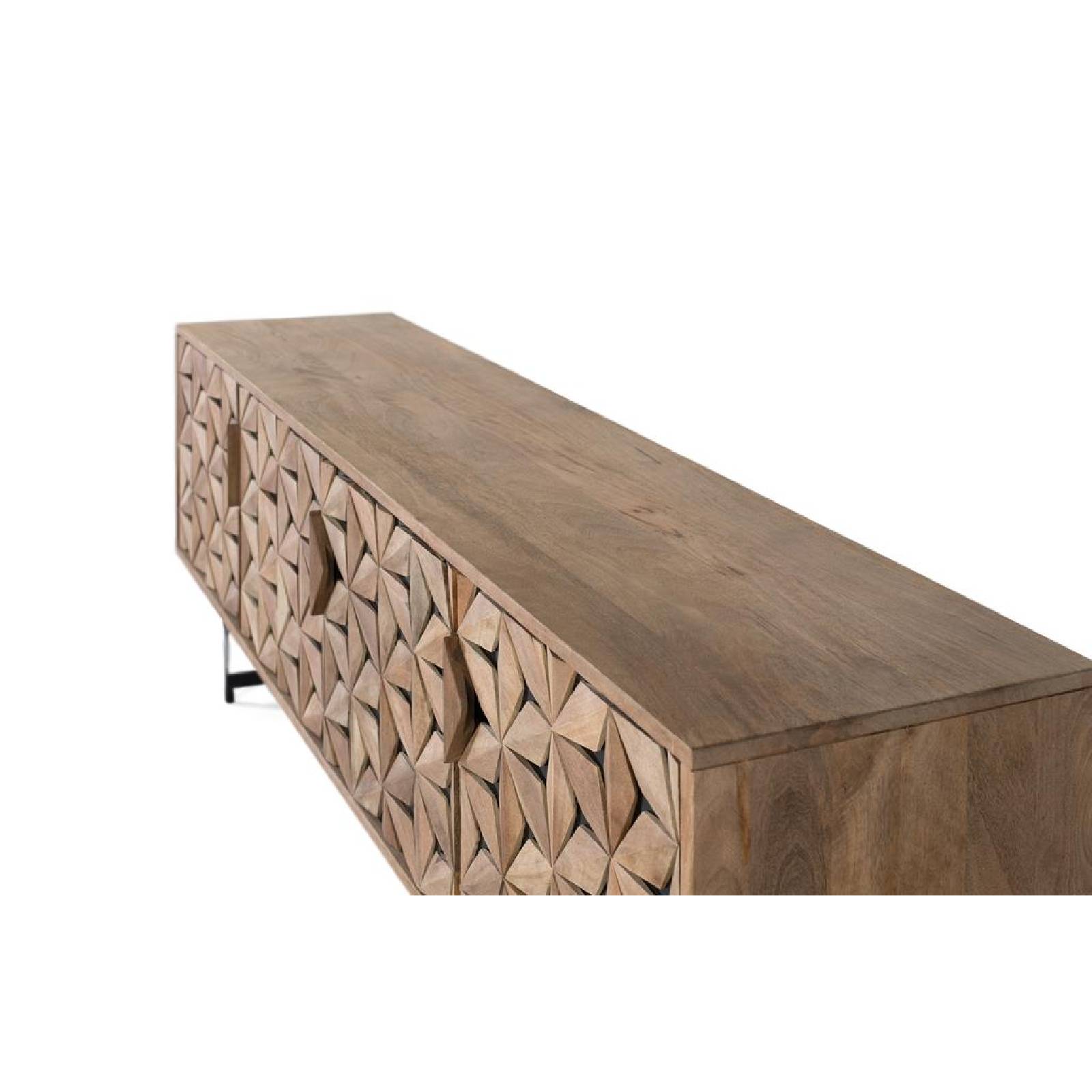 Ce meuble TV à quatre portes est fabriqué en bois de manguier, avec une finition naturelle qui met en valeur le grain du bois. Son design allie fonctionnalité et style moderne, mettant en valeur ses portes avec une gravure en relief de formes géométriques. Derrière deux des portes se trouve une étagère pratique pour organiser les objets, tandis que les deux autres portes cachent un grand espace ouvert. Les pieds, en fer avec un design en forme de « Y », sont peints en noir mat, offrant un contraste élégant avec la chaleur du bois et assurant stabilité et résistance au meuble.