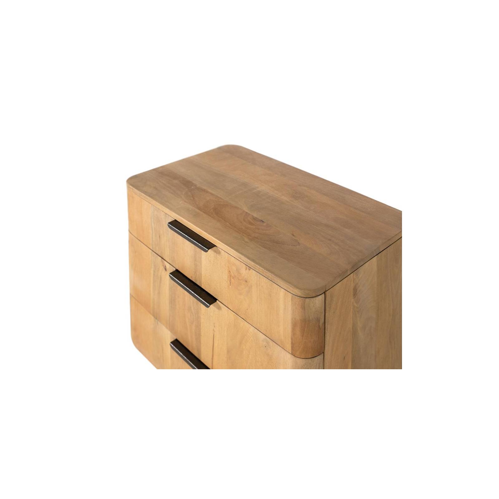 Table basse en bois de manguier de couleur naturelle, avec un design minimaliste et des coins arrondis qui soulignent son style moderne et chaleureux. Il est équipé de trois tiroirs spacieux, chacun doté de guides métalliques pour un coulissement fluide et fonctionnel. Les poignées en métal complètent le design, offrant un contraste subtil et élégant avec la finition naturelle du bois.