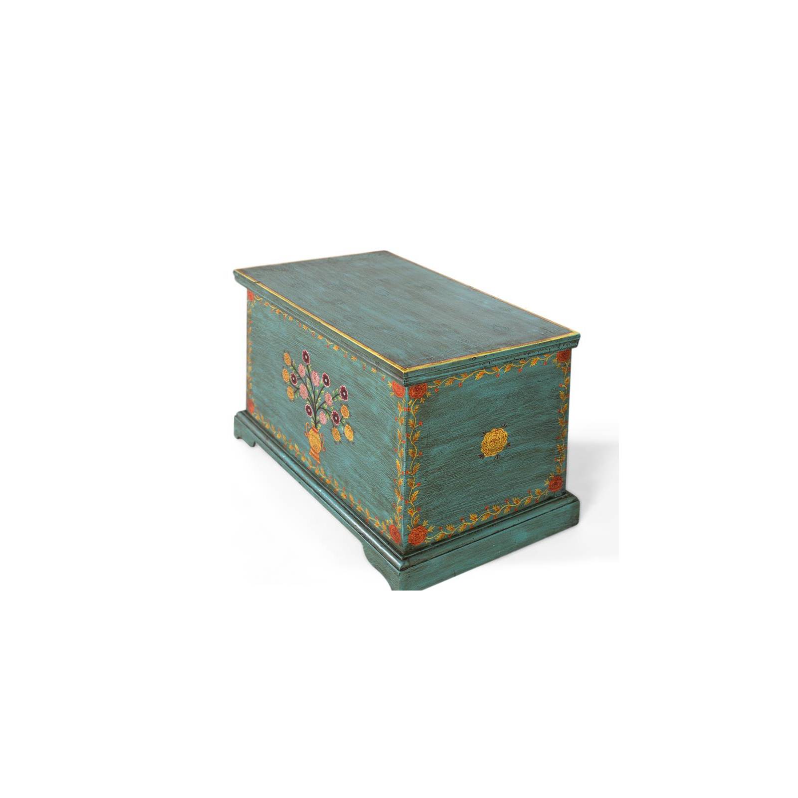 Il s'agit d'un tronc en bois de manguier. Sa structure est solide et présente des lignes traditionnelles, avec un couvercle à ouverture par le haut mis en valeur par une moulure périmétrique. La finition est vert turquoise, avec de délicats motifs floraux peints à la main disposés sur cette couleur de base. Le coffre repose sur un socle avec une moulure qui l'entoure entièrement.