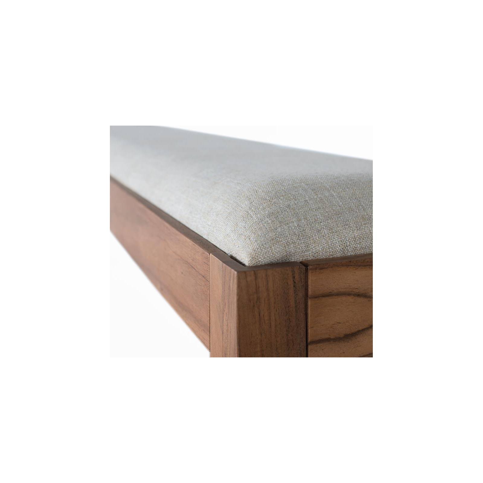Banc en bois d'acacia massif de couleur naturelle, recouvert de tissu. Étant en bois naturel, il peut venir avec ses nœuds et veines d'origine.