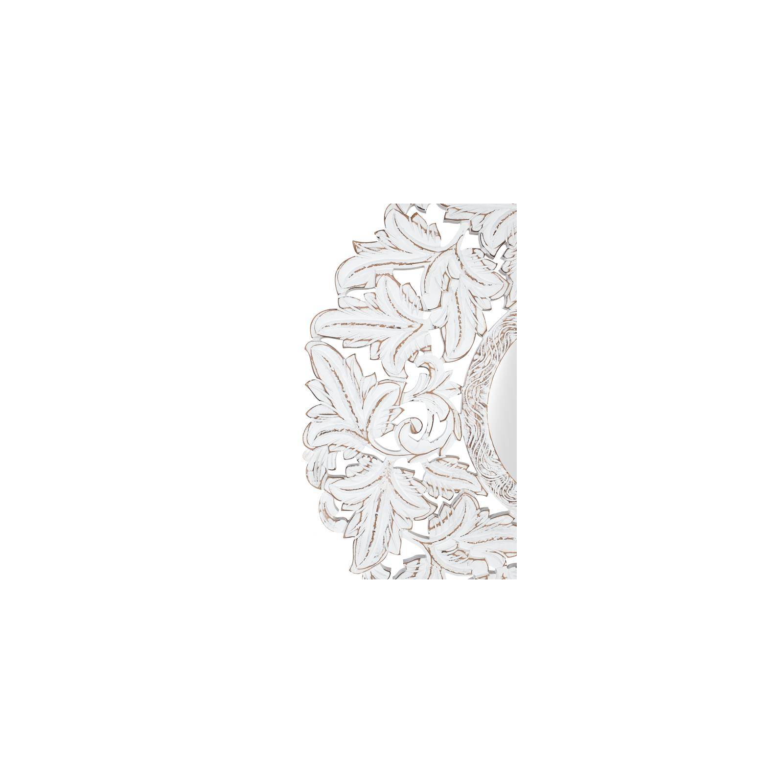 Ce miroir rond, sculpté à la main sur MDF, est une pièce qui allie délicatesse artisanale et design aux riches influences culturelles. La finition est en patine blanche qui met en valeur son travail élaboré. Idéal pour ajouter une touche exotique et sophistiquée à n'importe quel environnement.