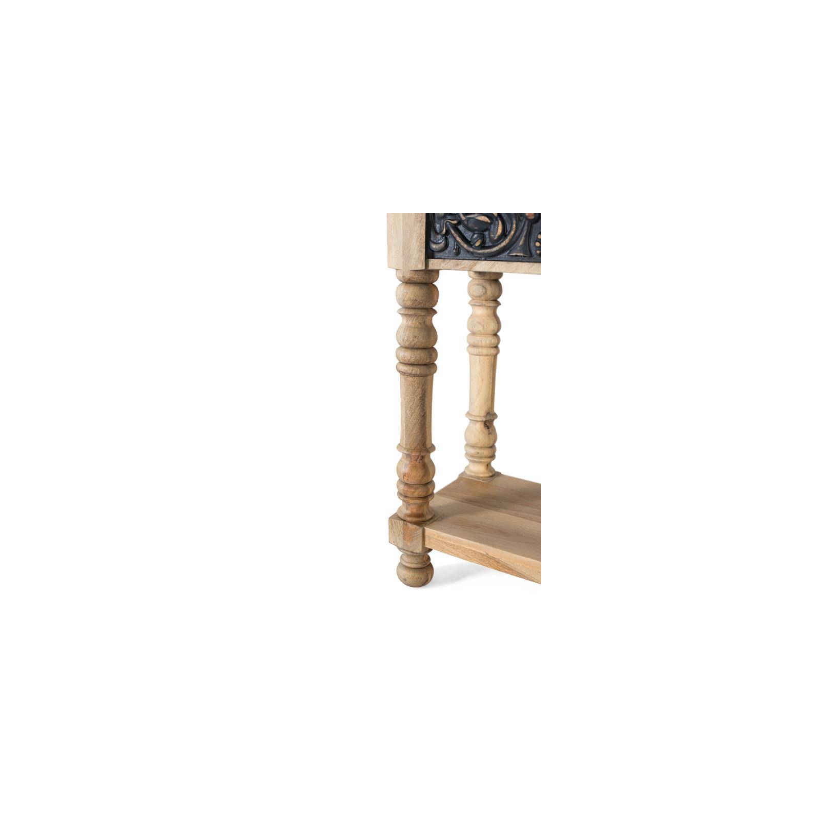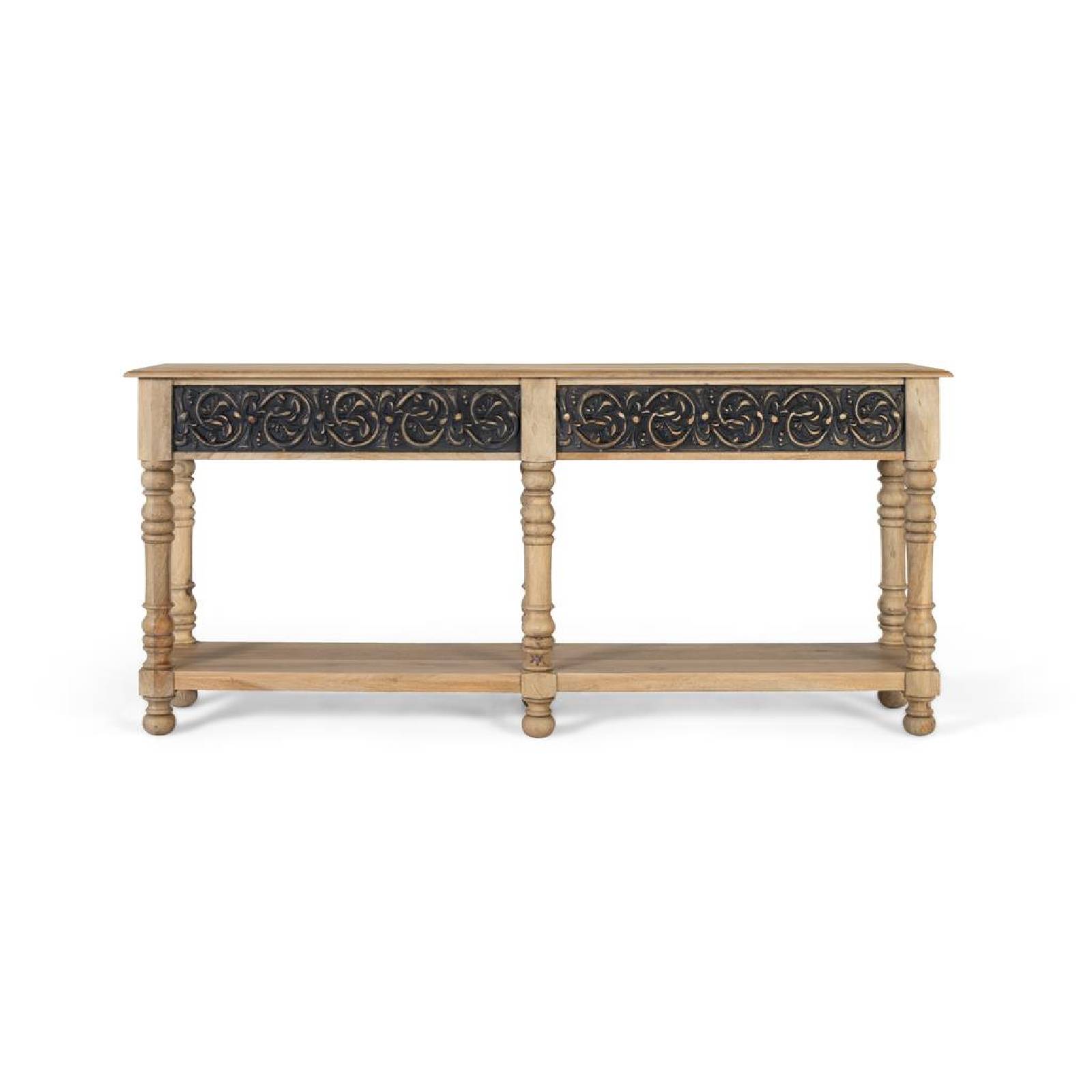 Cette imposante console d'entrée, réalisée en bois de manguier. La finition naturelle met en valeur le grain et les nuances du bois. La pièce présente un large plateau avec une moulure périphérique, et sa façade à double patine grise se démarque, créant un contraste attrayant. Sa structure est soutenue par six pieds tournés, aux formes élégantes et aux proportions équilibrées. En bas, une étagère continue offre un espace supplémentaire pour la décoration ou le rangement, offrant une fonctionnalité sans nuire à la légèreté visuelle de l'ensemble.