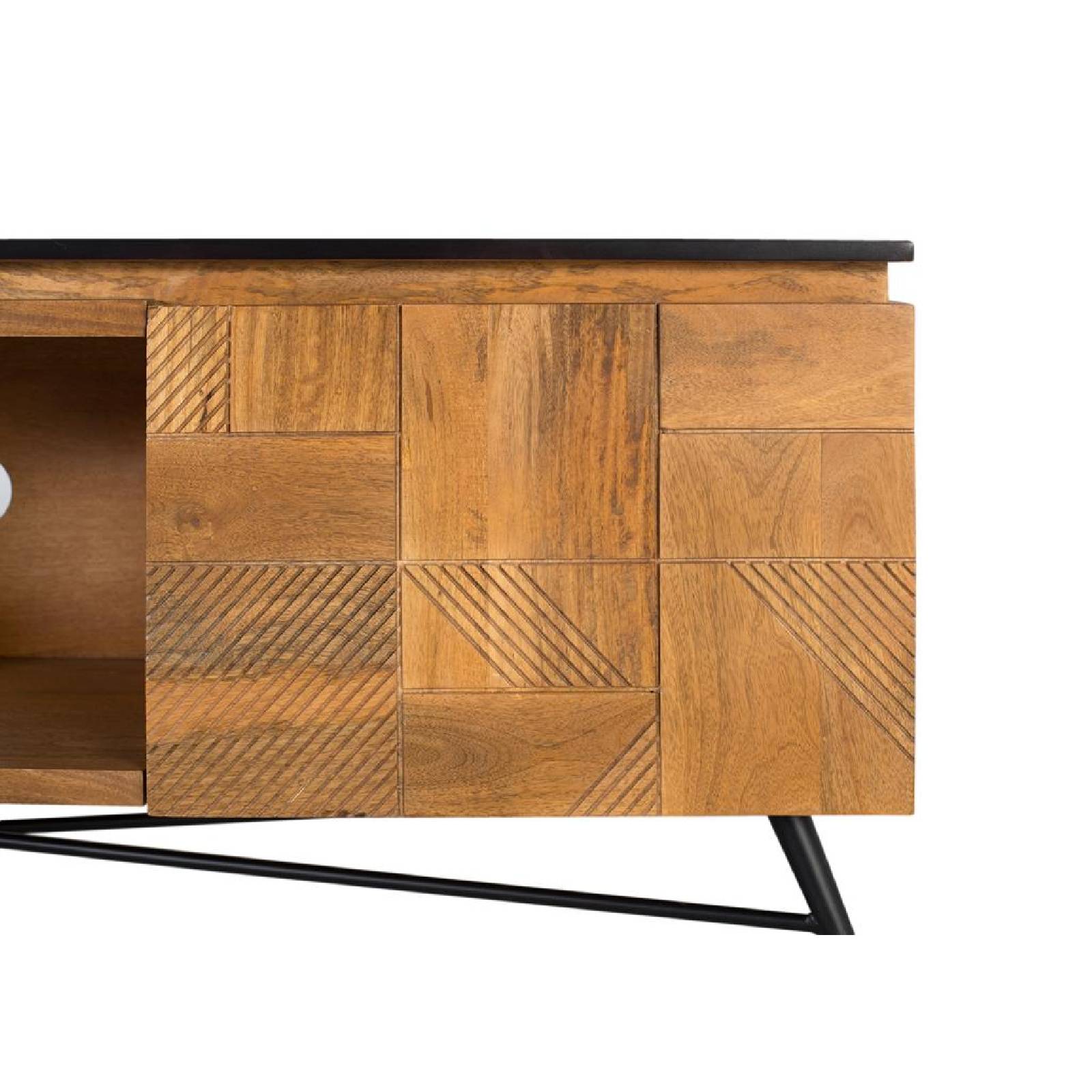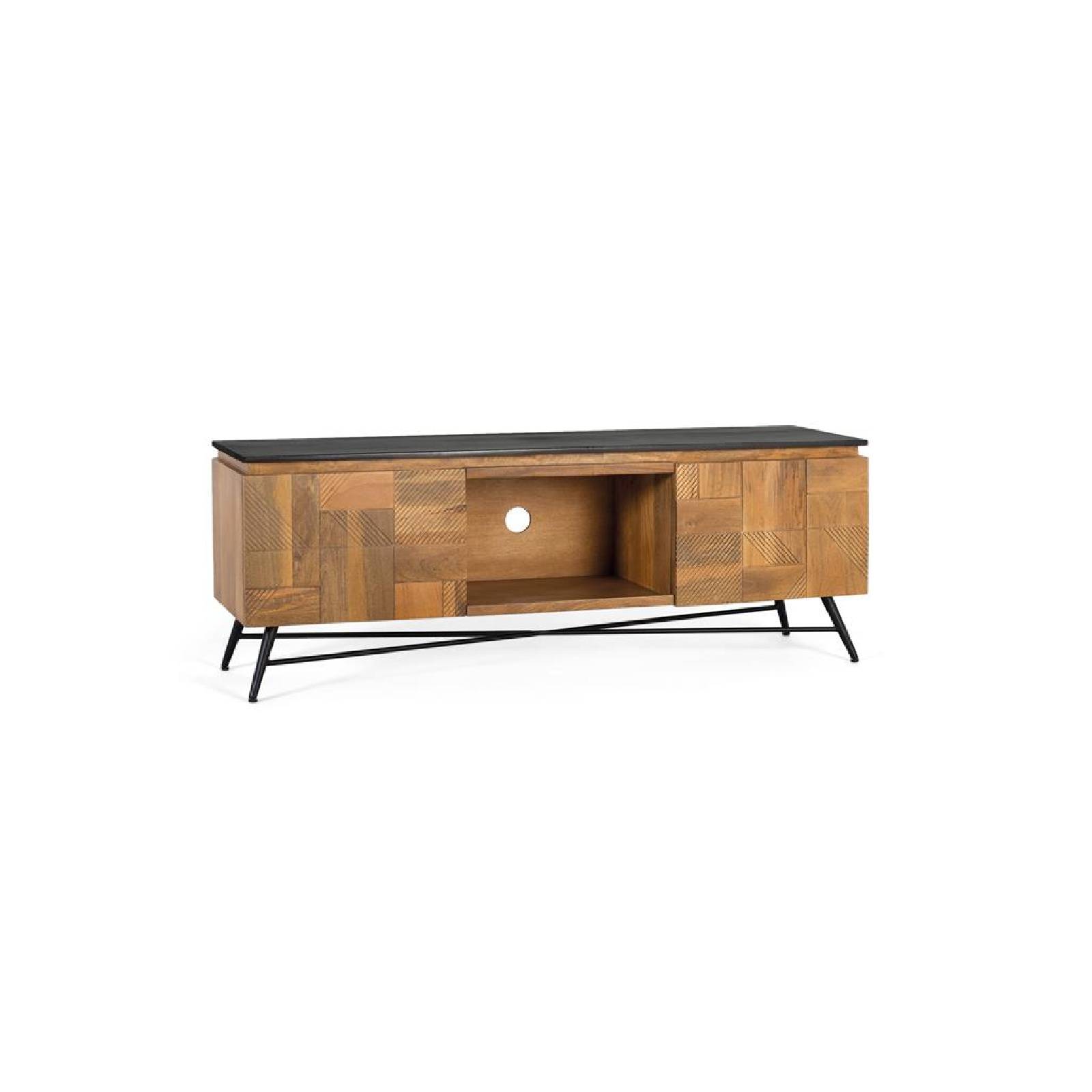 Ce meuble TV, fabriqué en bois de manguier, allie fonctionnalité et design dans une pièce moderne et élégante. Sa structure présente une finition naturelle qui met en valeur la beauté et le grain unique du bois, contrastant avec le plateau noir pour apporter une touche sophistiquée. Le design de ses deux portes est un élément clé, avec un motif de grain disposé dans des directions différentes qui créent un effet visuel dynamique et attrayant. Au centre, un renfoncement ouvert offre un espace pratique pour placer des appareils électroniques, garantissant un accès et une ventilation faciles. Sans boutons visibles, le meuble intègre des poignées intégrées au design. Sa base, en tube d'acier avec finition noire, apporte stabilité et légère touche industrielle, équilibrant parfaitement la chaleur du bois avec la solidité du métal.