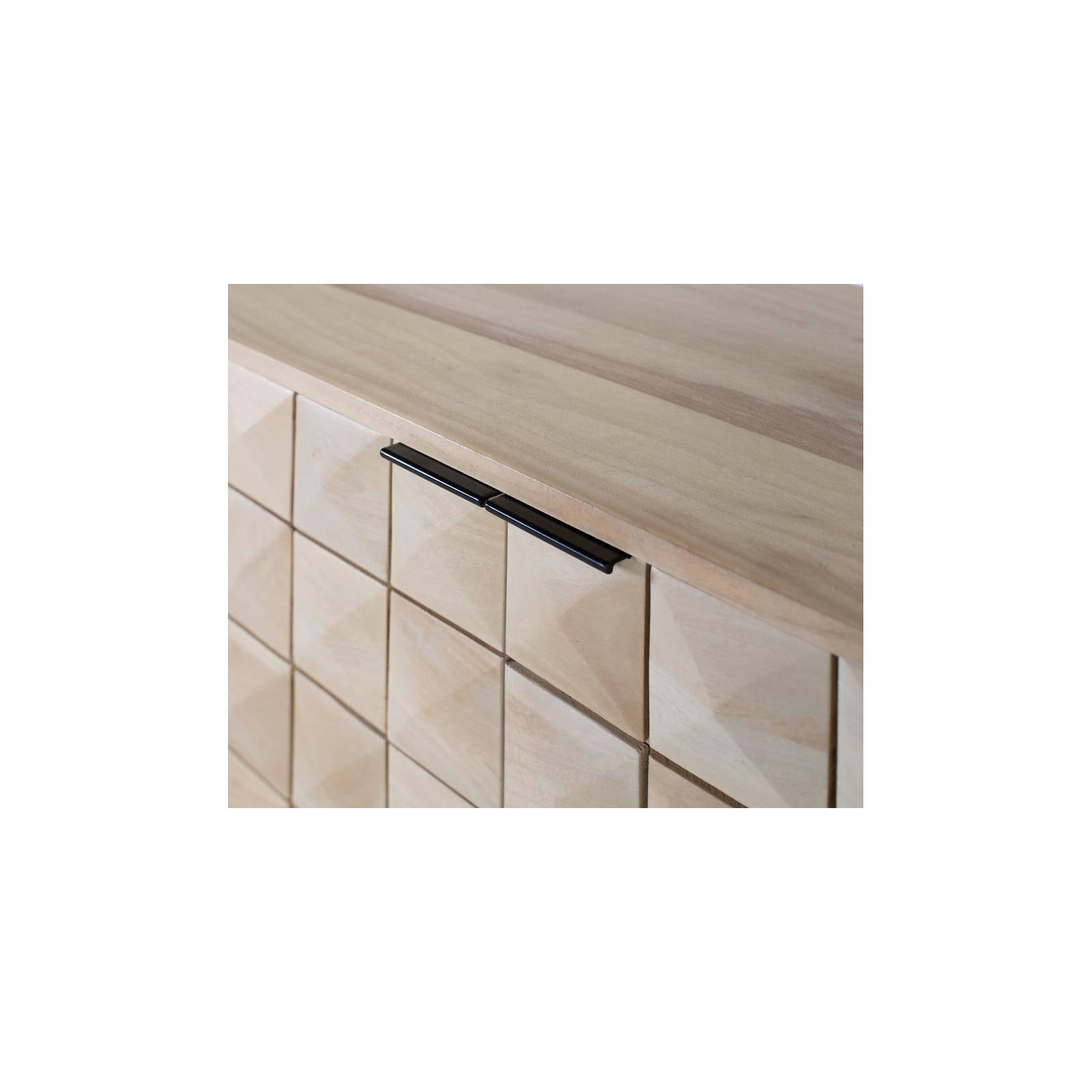 Ce buffet se distingue par son design élégant et contemporain. Il est fabriqué en bois de manguier, avec une structure extérieure peinte dans un ton noisette chaud qui met en valeur le grain.La façade du buffet est composée de quatre portes qui attirent immédiatement le regard. Chacune est peinte dans un noir mat raffiné et présente des reliefs aux formes géométriques qui créent un effet tridimensionnel, ajoutant de la profondeur et une touche distinctive.Cette pièce est soutenue par une base minimaliste composée de tubes de fer carrés, peints dans un ton doré confortable. Ce détail métallique apporte stabilité et résistance, contrastant harmonieusement avec le bois.