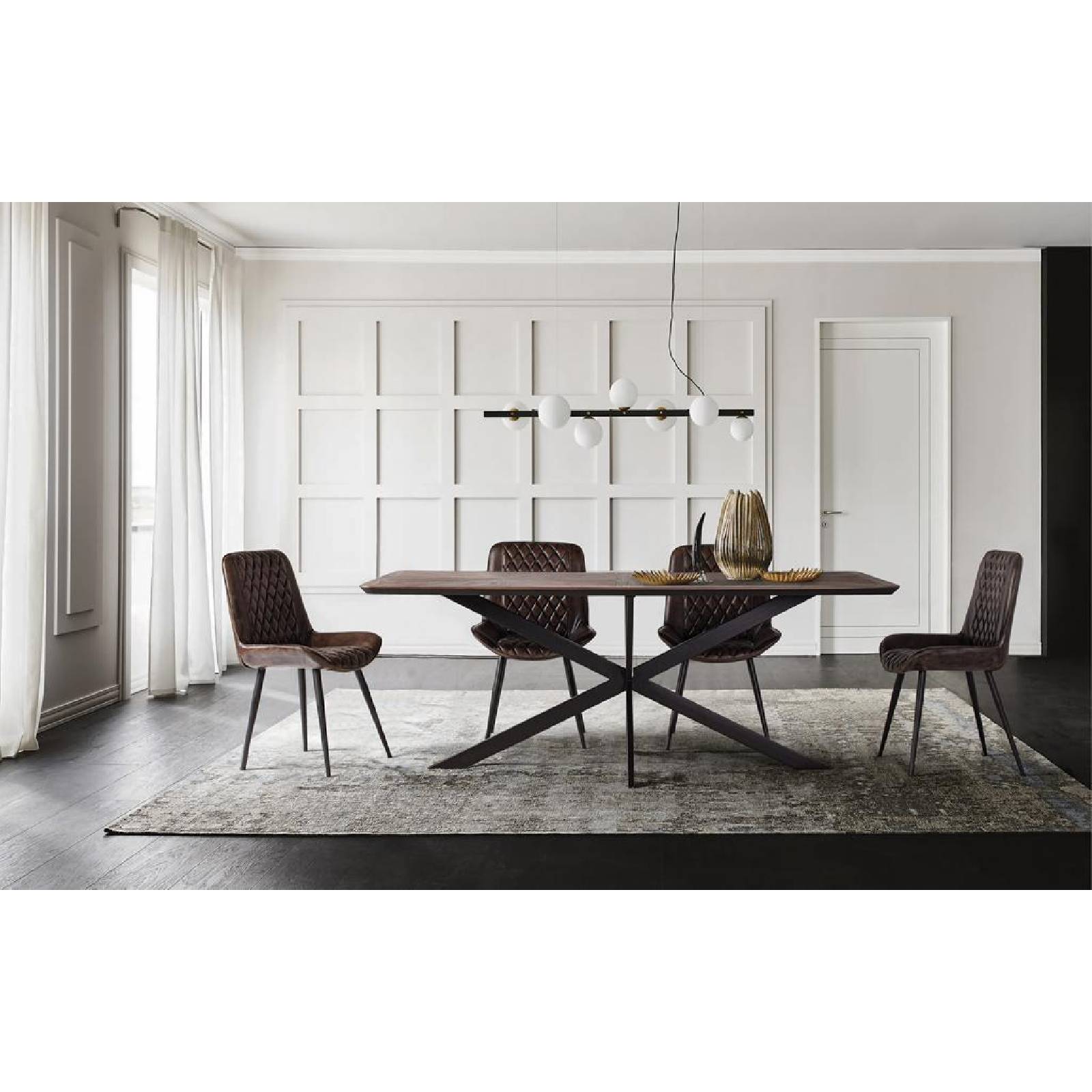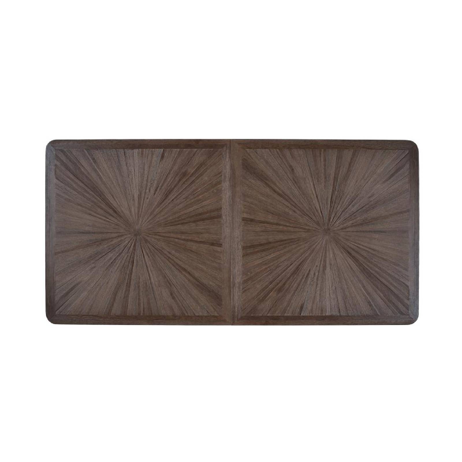 La table à manger est conçue avec un plateau rectangulaire en bois de teck recyclé. Le dessus présente un motif de marqueterie élaboré avec un design radial en quadrants, ce qui crée un effet visuel symétrique. La base est composée d'un ensemble de pieds en fer entrecroisés en forme de « X », peints en noir mat. Grâce à sa conception robuste, cette table est idéale pour les grandes salles à manger ou les espaces ouverts cherchant à intégrer la fonctionnalité à une esthétique contemporaine.