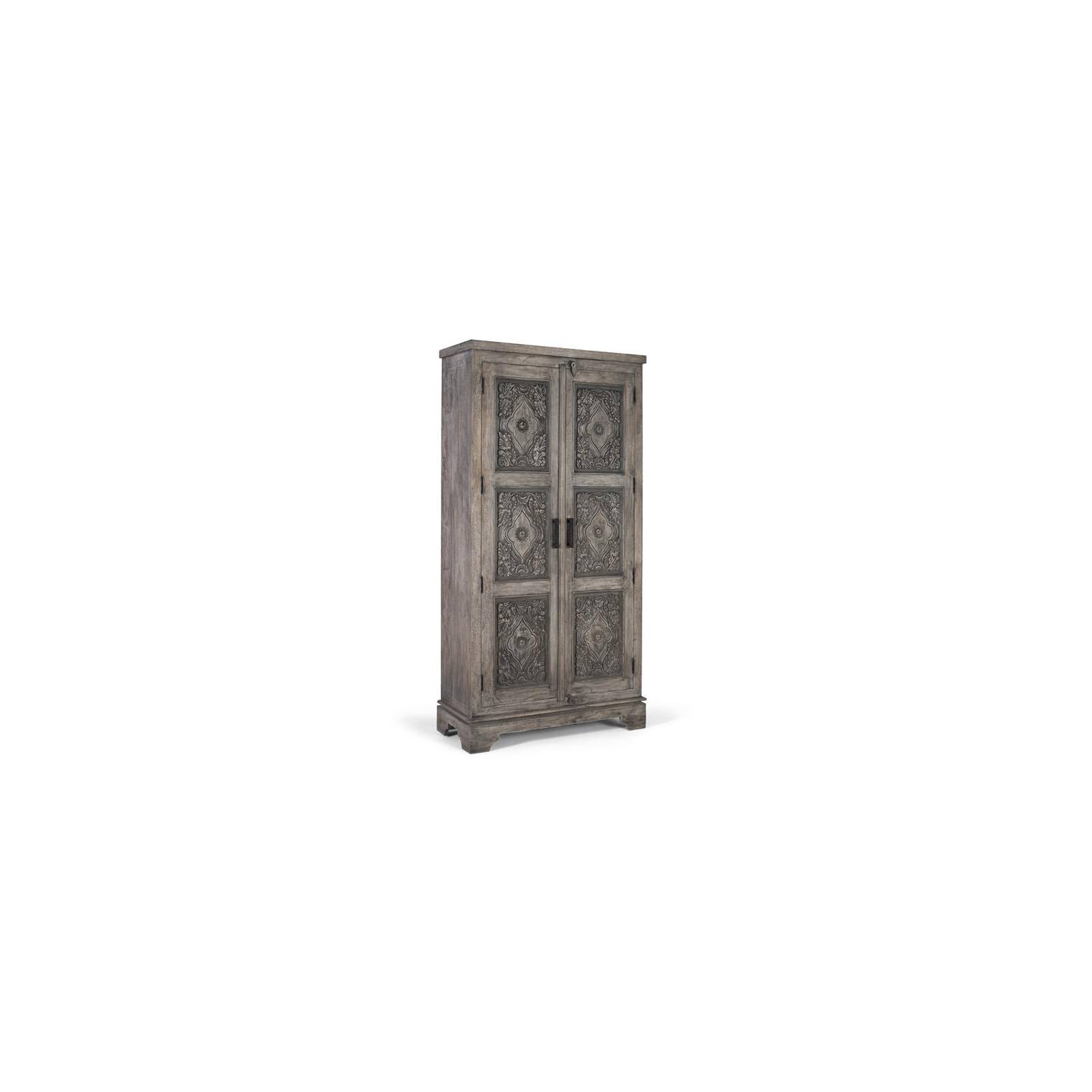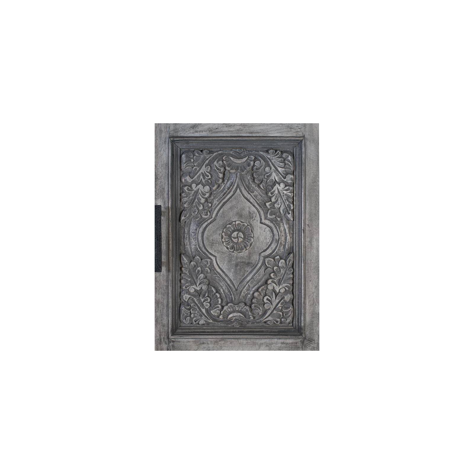 Armoire en bois de manguier massif, conçue avec une structure robuste qui garantit la durabilité. Sa finition gris doux offre une esthétique contemporaine sans perdre le caractère naturel et chaleureux du bois. La façade est composée de deux portes, chacune divisée en trois cadres qui encadrent des panneaux sculptés à la main avec des figures d'inspiration ethnique. À l'intérieur, l'armoire dispose de quatre étagères spacieuses, idéales pour organiser les vêtements. L'étagère supérieure est amovible, ce qui vous permet de profiter de la hauteur du meuble pour suspendre des vêtements plus longs à la barre.