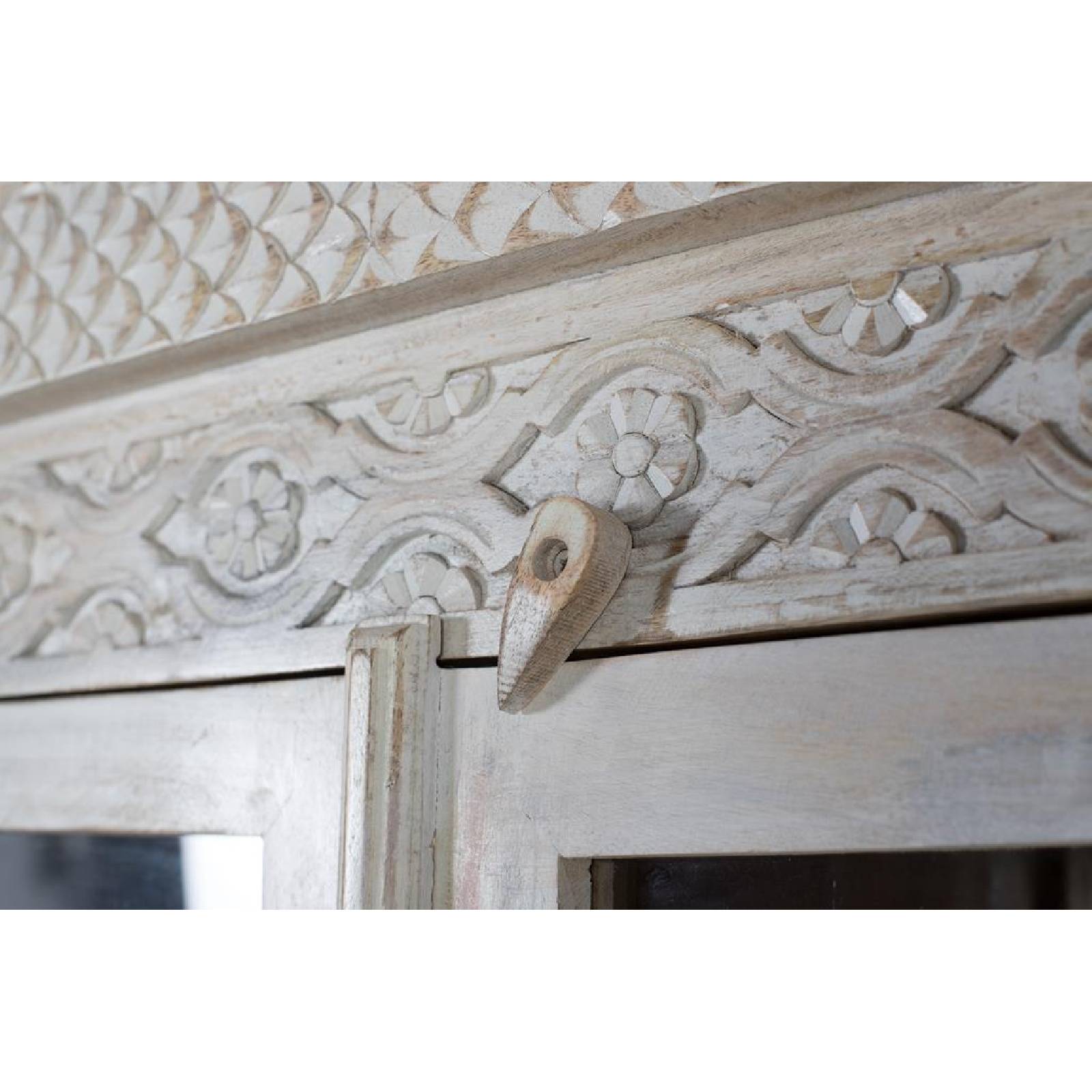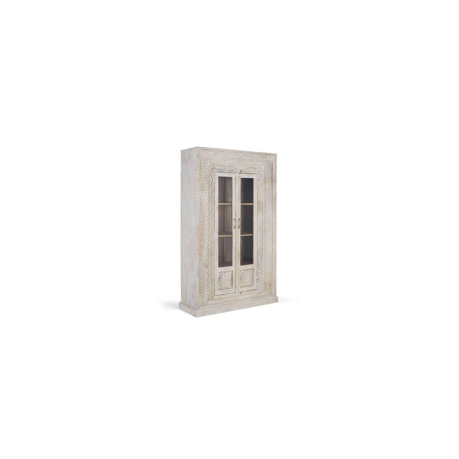 Superbe armoire en bois de manguier, avec une finition naturelle qui vous permet d'apprécier la beauté du grain et de la texture du bois. Cette pièce se distingue par son savoir-faire sur toute la façade, où des détails sculptés à la main recouvrent la surface. Les deux portes d'entrée, encadrées de bois, sont équipées de panneaux de verre qui permettent de voir l'intérieur. Derrière les portes, quatre étagères spacieuses offrent un espace de rangement généreux. L'ensemble repose sur un socle solide qui surélève légèrement le meuble, renforçant sa présence et lui assurant une stabilité.