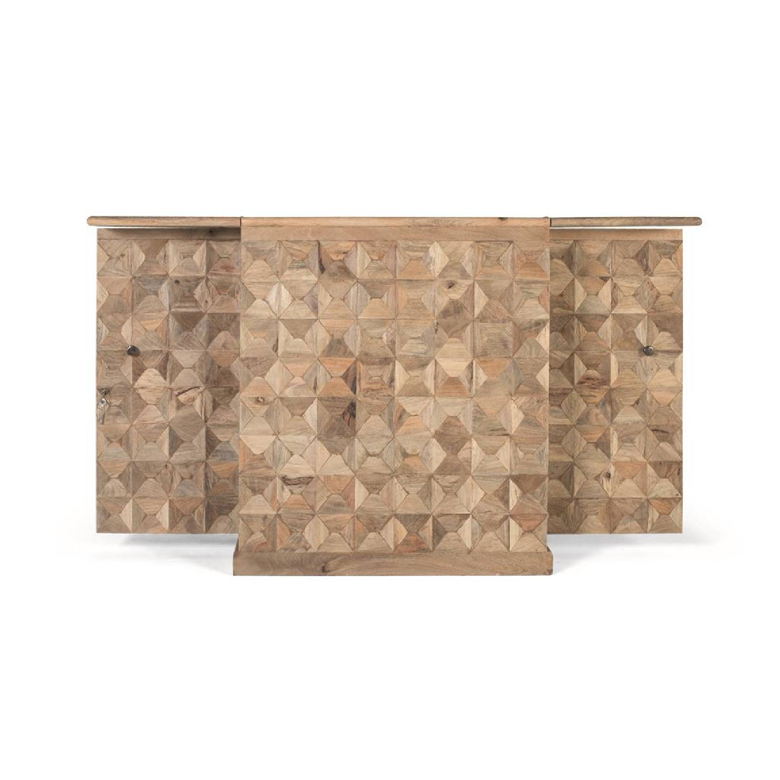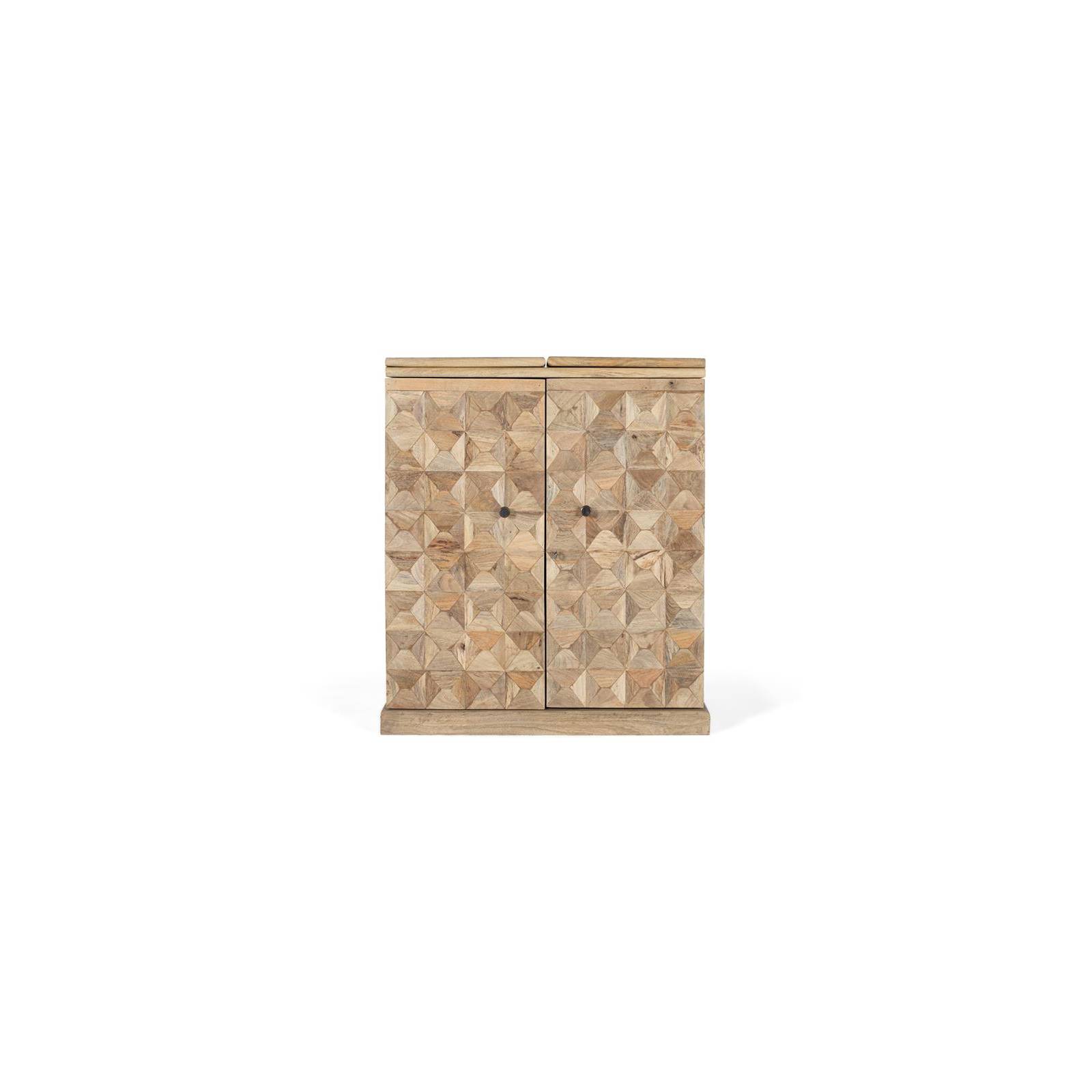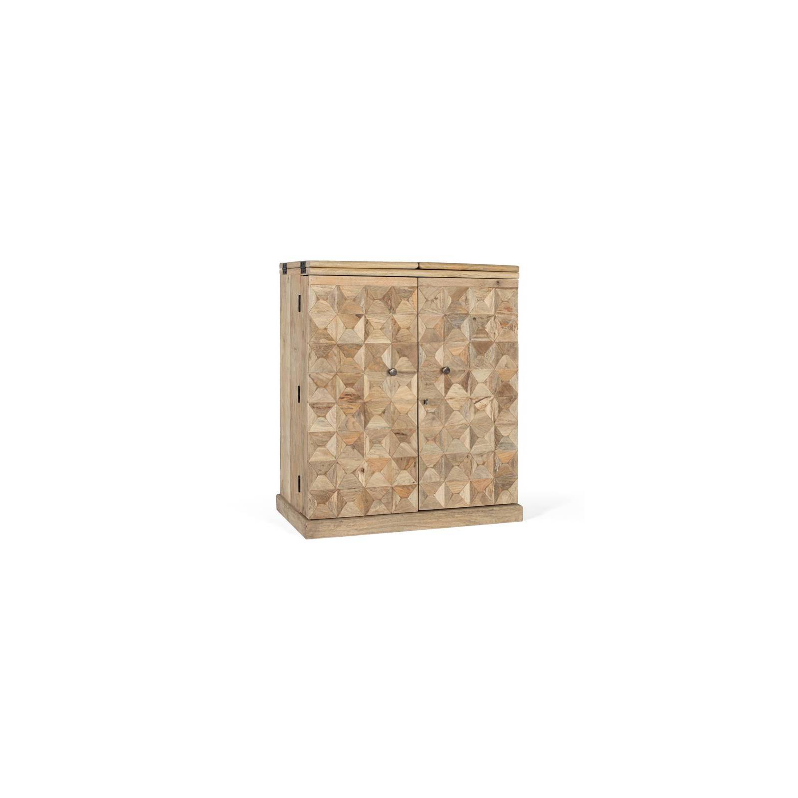 Ce meuble bar élégant est fabriqué en bois de manguier et fini dans une couleur naturelle. Lorsque vous ouvrez ses portes et dépliez le couvercle, l'armoire double de longueur, se transformant en un espace de travail idéal pour préparer et servir des boissons. À l'intérieur, on retrouve un agencement soigneusement agencé de tiroirs et de compartiments spécialement conçus pour ranger bouteilles, verres et ustensiles. La façade du meuble est recouverte de pièces de bois disposées selon des motifs géométriques, créant une texture visuelle moderne et dynamique qui contraste avec la chaleur naturelle du bois de manguier.