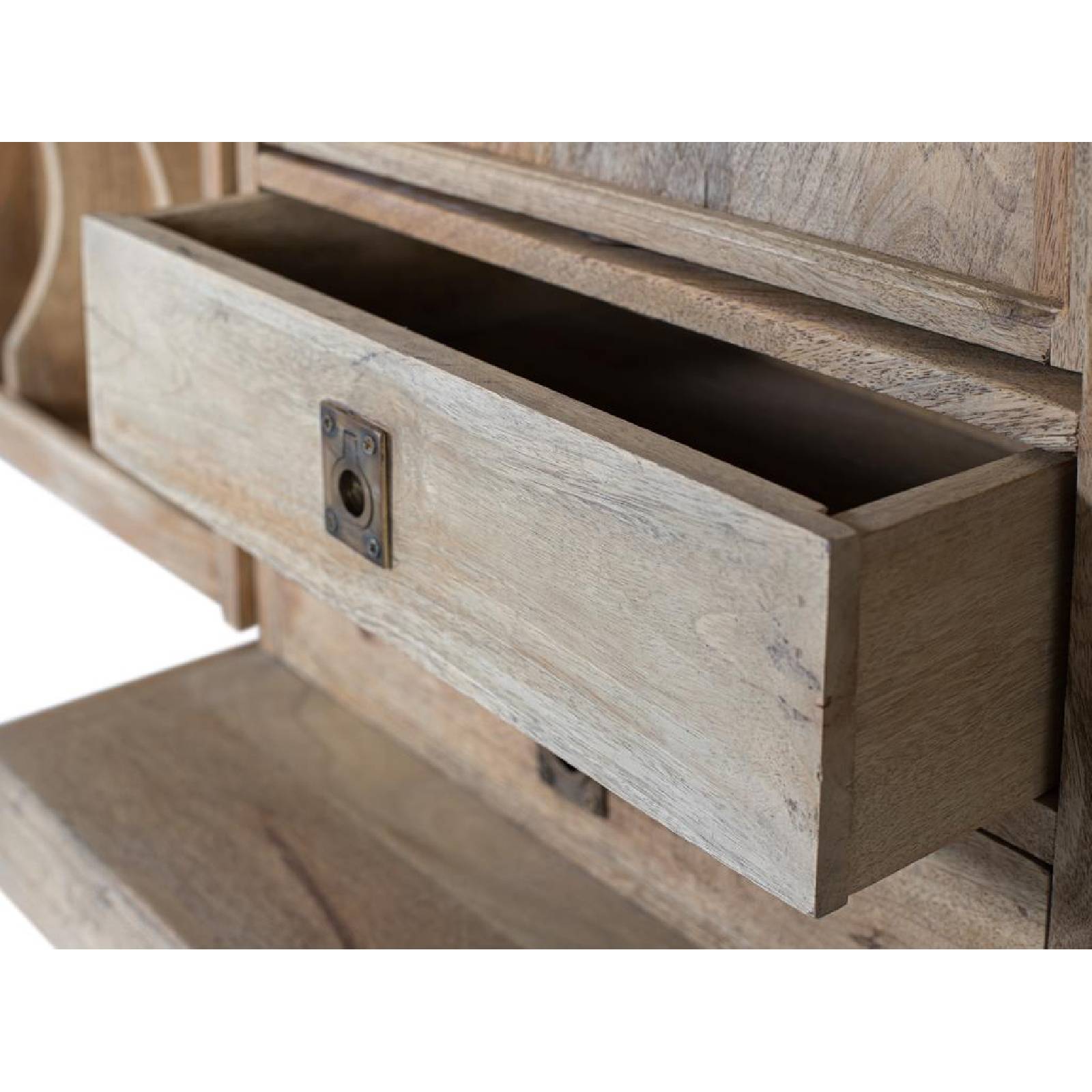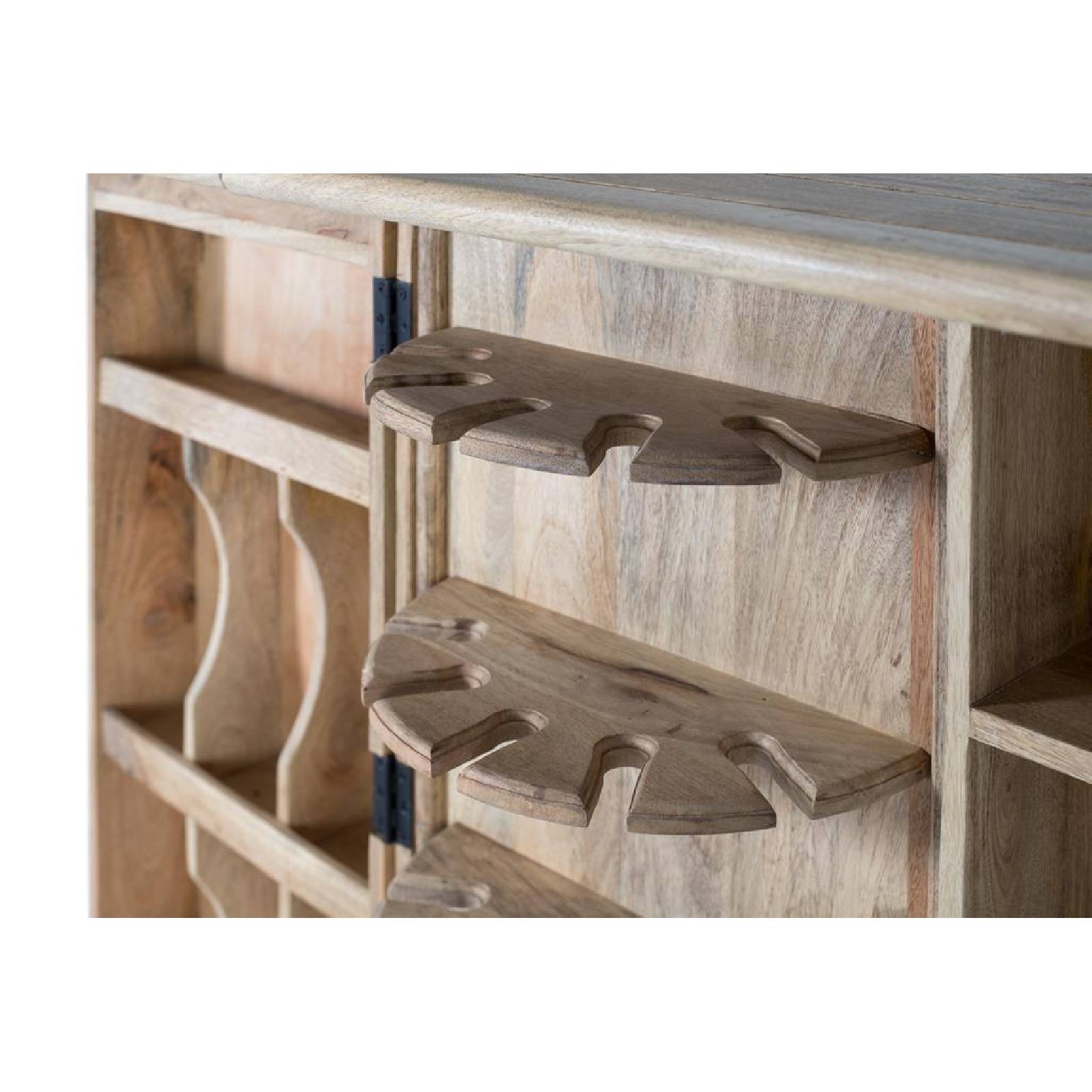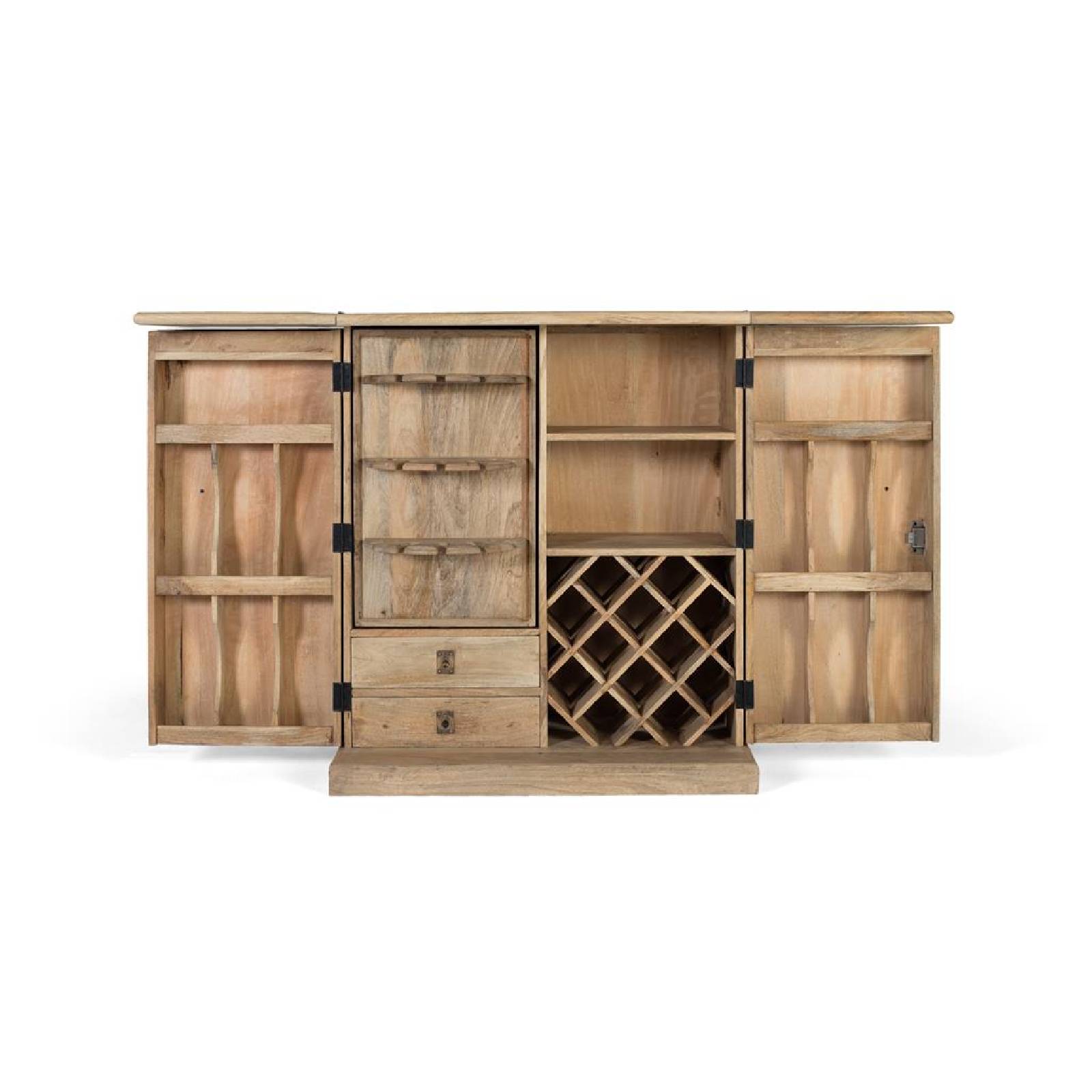 Ce meuble bar élégant est fabriqué en bois de manguier et fini dans une couleur naturelle. Lorsque vous ouvrez ses portes et dépliez le couvercle, l'armoire double de longueur, se transformant en un espace de travail idéal pour préparer et servir des boissons. À l'intérieur, on retrouve un agencement soigneusement agencé de tiroirs et de compartiments spécialement conçus pour ranger bouteilles, verres et ustensiles. La façade du meuble est recouverte de pièces de bois disposées selon des motifs géométriques, créant une texture visuelle moderne et dynamique qui contraste avec la chaleur naturelle du bois de manguier.