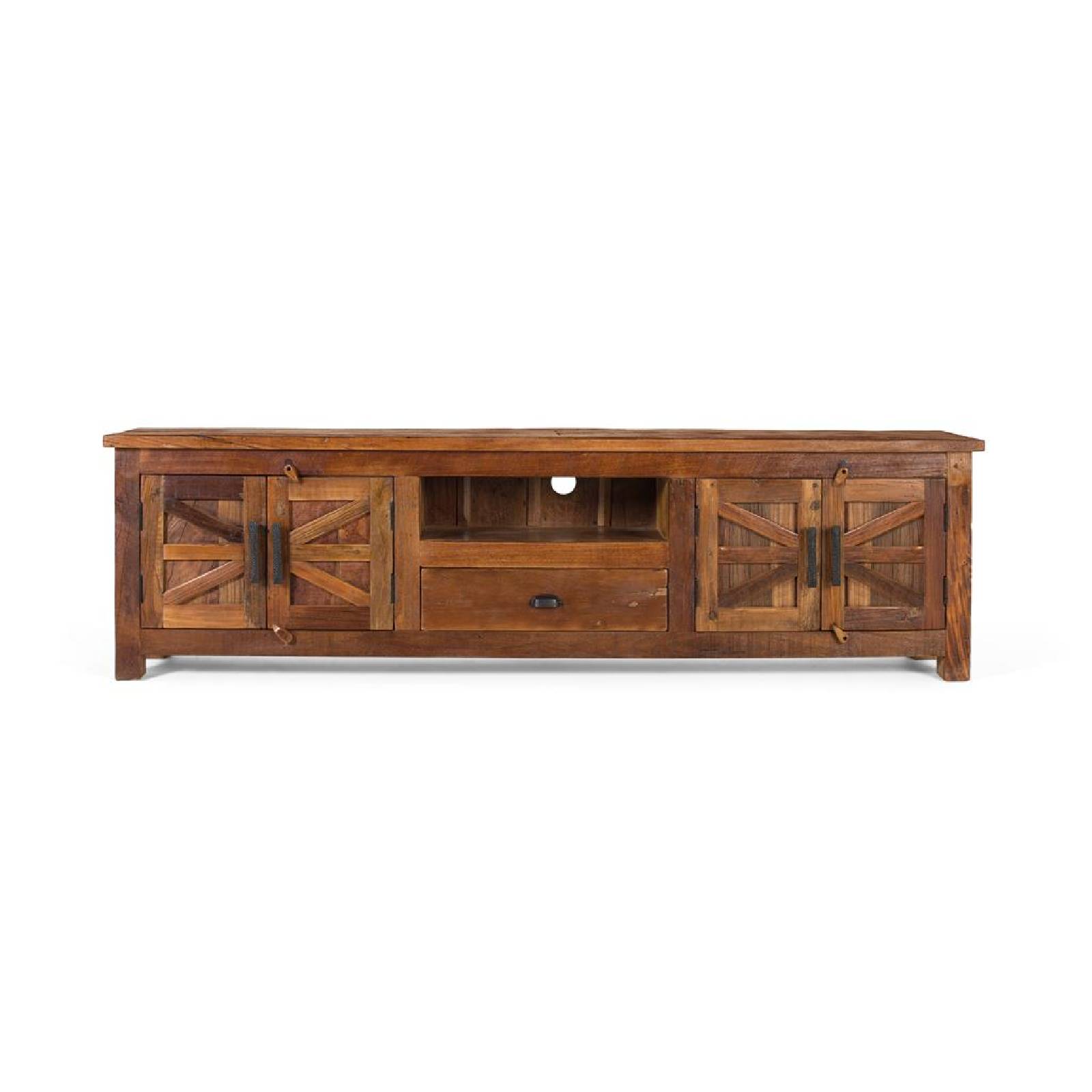 Ce meuble TV, fabriqué à partir de bois recyclé, allie un design rustique et fonctionnel à une structure robuste. La conception se compose d'un grand tiroir central et d'un espace ouvert juste au-dessus. Sur les côtés, deux portes en bois dissimulent des compartiments spacieux, offrant un espace de rangement supplémentaire pour les livres, les films ou tout autre objet que vous souhaitez garder organisé et hors de vue. Les lignes simples et l'aspect vieilli du bois récupéré lui confèrent un charme unique.