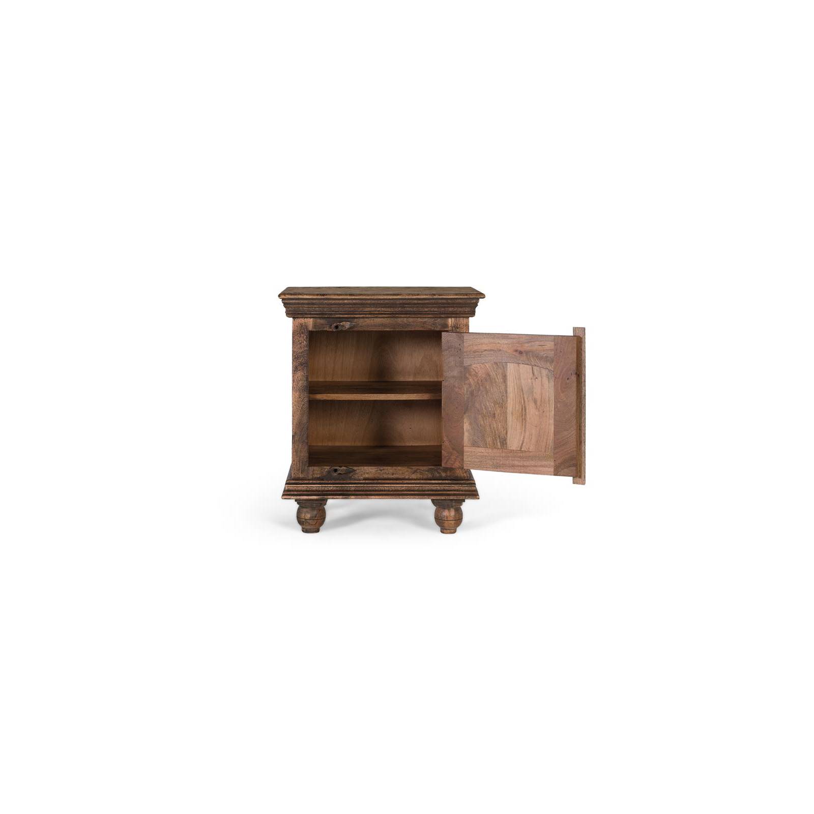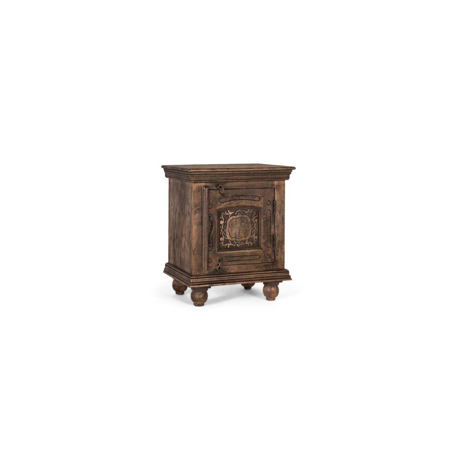 Table de chevet en bois de manguier massif, avec une finition rustique qui met en valeur le veinage naturel et le caractère artisanal du matériau. Elle est dotée d'une porte d'entrée ornée d'une sculpture florale centrale et de ferrures en fer forgé. Son design compact en fait une table de chevet idéale, une table d'appoint dans un salon ou un élément décoratif dans un intérieur rustique, colonial ou ethnique. Robuste, fonctionnelle et dotée d'une personnalité unique.