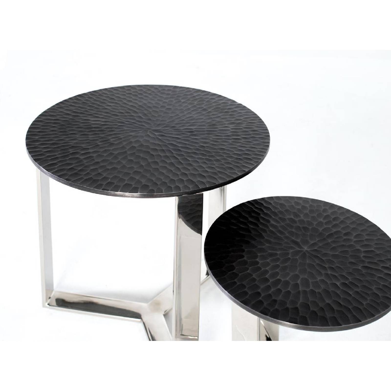 Cet ensemble de deux tables basses est une combinaison parfaite de design contemporain et de caractère artisanal. Entièrement fabriqués en métal, ils se distinguent par leurs surfaces martelées, qui offrent une texture riche et un jeu attrayant de lumière et d'ombre. La finition noire des plateaux met en valeur les détails martelés. Les bases, en aluminium, contrastent avec le ton sombre des plateaux, créant un équilibre visuel élégant. Sa conception structurelle est légère mais robuste, garantissant la stabilité sans sacrifier le style.