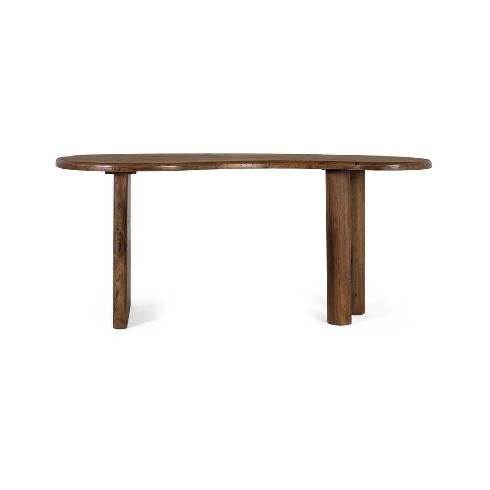 Table de bureau élégante de style rustique en bois de teck et finition en noyer. Le plateau du bureau est large avec unmoulure décorative. Côté structure, le bureau présente un design asymétrique qui lui donne de la personnalité. Un côté est orné de pilastres et l'autre côté est lisse et complet, conservant la solidité et offrant un contraste harmonieux. Ce bureau n'est pas seulement une pièce fonctionnelle, mais aussi un élément décoratif qui ajoute du caractère et de la distinction à n'importe quel espace, idéal pour ceux qui recherchent un équilibre entre la beauté rustique et l'artisanat solide.
