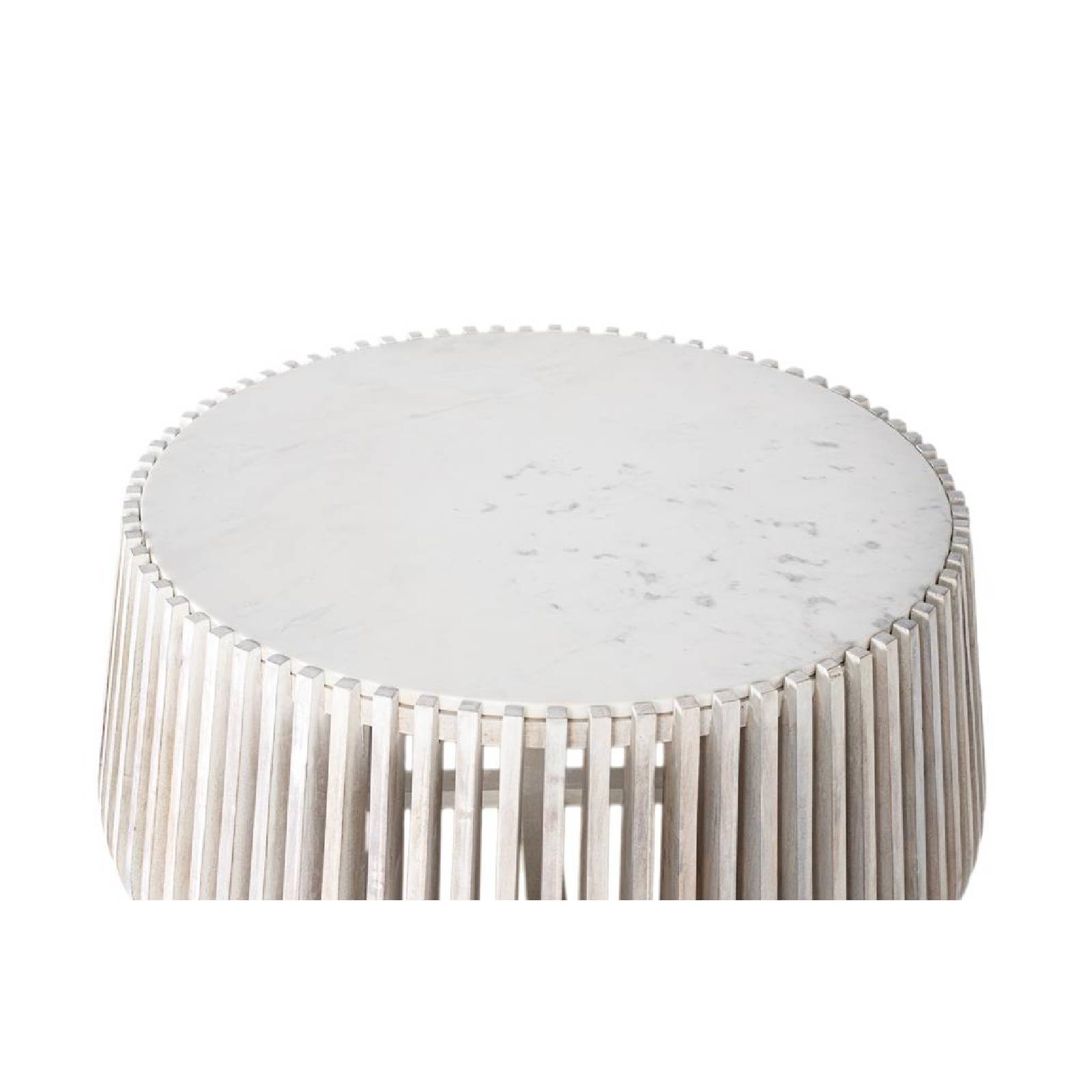Cette table basse se distingue par son design contemporain élégant et son caractère sculptural. Avec sa forme ronde et ses proportions équilibrées, elle allie matériaux nobles et modernité. Son plateau est en marbre blanc veiné, finition polie, et son piètement est composé d'une structure cylindrique formée de lattes de bois verticales disposées régulièrement. Cette structure allie esthétique et stabilité.