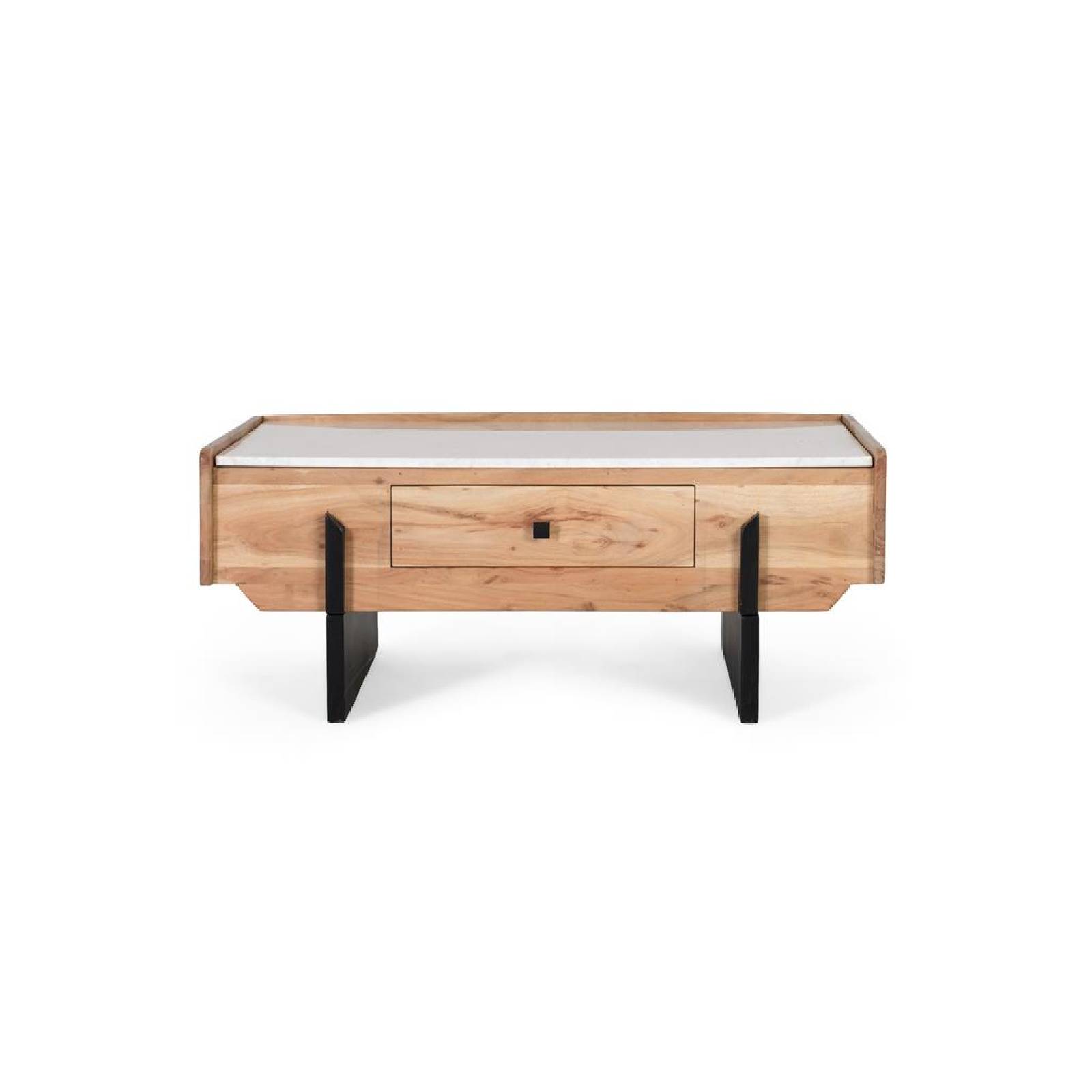 Cette table basse est une pièce fonctionnelle, fabriquée en bois d'acacia massif avec une finition naturelle qui met en valeur le veinage et les tons chauds du matériau. Son élément le plus distinctif est son plateau en marbre blanc délicatement veiné de gris, qui apporte élégance et contraste. La table est dotée d'un tiroir accessible des deux côtés, pratique et polyvalent pour ranger de petits objets. Les pieds en métal noir apportent une touche industrielle moderne à la table et assurent sa stabilité.